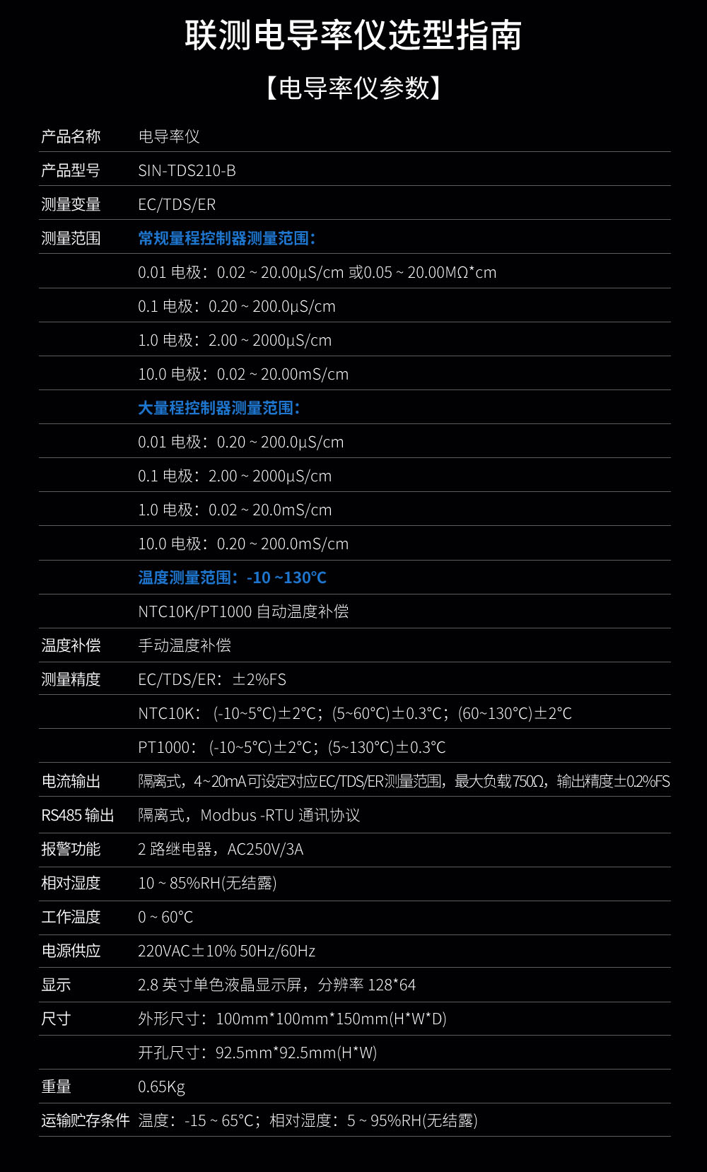 IN-TDS210-B工業電導率儀表,廣泛應用于火電、化工化肥、冶金、環保、制藥、生 化、食品和自來水等行業。控制器主要對溶液中的電導率/總溶解固體/ 電阻率和溫度進行連續監測。