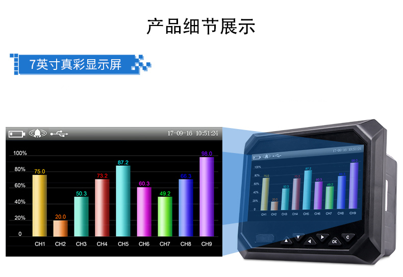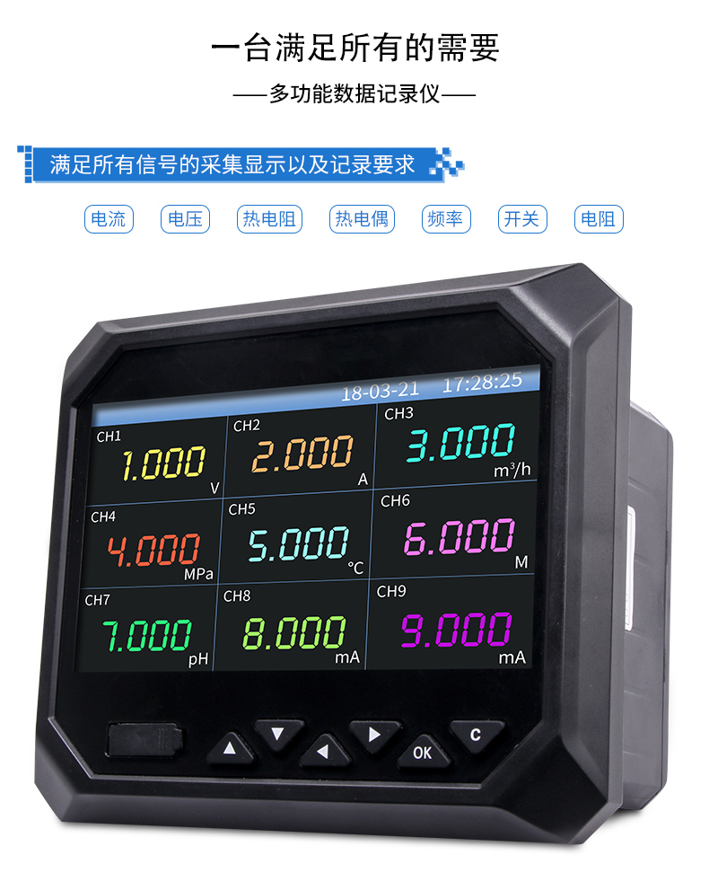 無紙記錄儀是將采集的數據/運算數據以時間為基軸記錄在儀器內部的存儲系統中,無消耗任何常用的記錄設施,如:紙張、筆墨。記錄在儀器內部的存儲數據,通過運算、模擬后顯示在液晶屏。常用顯示用液晶屏比較廣泛。在液晶屏屏幕上,可以顯示數字顯示、棒圖顯示、曲線顯示、報警列表等。無紙記錄儀采集的數據,常用的有:溫度、壓力、流量、液位、電壓、電流、濕度、頻率、振動、轉速等。
